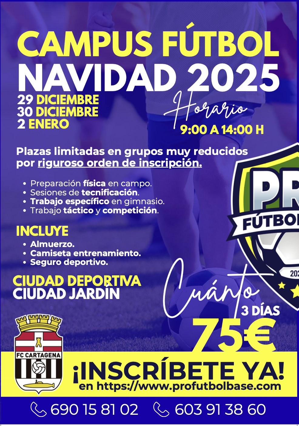 ![]() | CAMPUS NAVIDAD CARTAGENA FC CAMPUS NAVIDAD 2025-2026 FC CARTAGENA - PROFÚTBOLBASE | Ciudad Jardín | 2025-12-29 | 9:00 | Asistir |